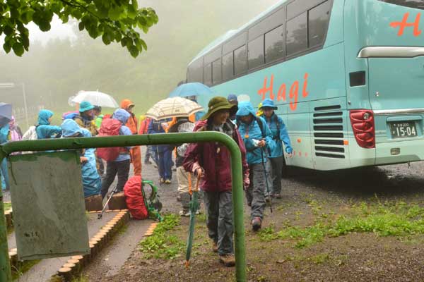 週末の大気が不安定で、金曜日の夜に実施を決定したものの、予報がころころ変わり、当日は朝から雨模様となってしまった。この雨で参加を取りやめた方もいて、最終的に9名の方がキャンセルとなり、生徒さんは16名の参加となった。初心者登山教室は、今日の実技としての御前山が最後のカリキュラムとなる。空が幾分明るくなっているのがせめてもの救いで、登山口では止んでいるのではと望みをかけてバスは定刻に出発した。