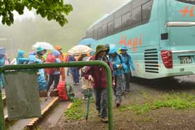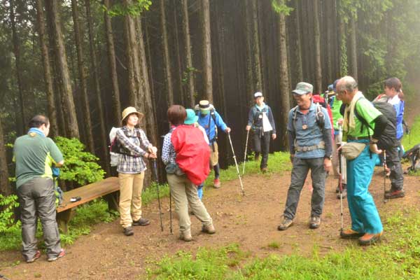 雨模様ということは、座学でも勉強した雨対策のひとつとして、雨具などの装備の実地検証が可能となる。確認したところ傘は、みなさん全員が持参していたものの、上下分かれている合羽は全員とまではいかなかった。ザックカバーやスパッツなどは半分以上の方が用意していたが、全部を揃えるのはなかなか難しいことを実感した。登山口で体操ののち、出発したが雨は止まず、急なくだりを足元に気を付けながら歩いていく。