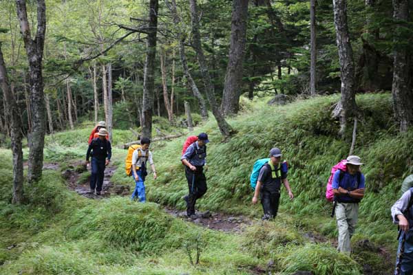 朝食5時半に合わせ、5時に起床し食堂に下りるとテレビで東京のオリンピック招致決定に登山客が喜んでいた。小雨とガスの中、小屋を6時半過ぎ出発。ジョーゴ沢を渡った所で休息を取り、赤岩の頭までの急登に備える。ゆっくりだが確実な歩きで高度をかせぐ。受講生の成長ぶりを感じる。