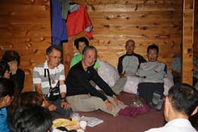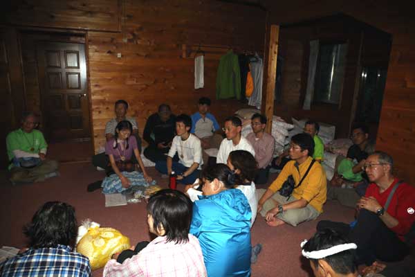小屋に戻り夕食後、大部屋に集合し、少々の飲物(アルコール抜き)と茶菓子でミーティングとした。今回の山行のもう一つの目的である初級登山教室卒業後の方向付けとして、日本山岳会、東京多摩支部の概要など説明し、入会の案内をした。受講生から各自の思いをお話しいただいた。就寝時には風雨が強くなっており、明日の天気が気がかりであったが、早々と眠りに着いた。