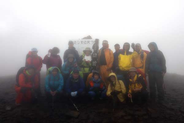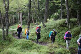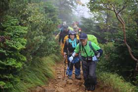 赤岩の頭手前で小休止後、赤岩の頭に出る。雨とガスで硫黄岳は見えない。時々、強風が吹きつける。硫黄岳の広い頂上では、雨と強風で記念写真を撮り早々に下山する。赤岩の頭を通り過ぎ森林帯の登山道で休息する。風もなくホットする。ここから急な下りをこなし赤岳鉱泉に無事到着。小屋の中の食堂で弁当の昼食をとる。小屋に礼を言い雨の中、下山に向け出発。堰堤広場までは、まだ皆緊張していたが、堰堤からの林道は、緊張の緩みと疲労から、若干ペースが落ちた。皆を励まし美濃戸口に全員無事下山。手配の貸切バスで「もみの湯」に入浴し帰路に着いた。