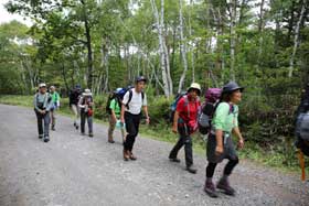美濃戸山荘手前で小雨がちらつき始めた。美濃戸山荘では、小屋の人の好意により小屋内に全員入り昼食とした。天候状態から雨具を着用で出発。林道の道を進みハナイカリ、ヤマトリカブトを観察しながら堰堤広場で休息し橋を渡り、ここから本格的な登山道となる。