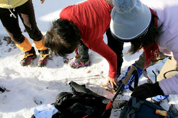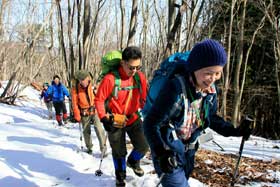 登山道入口(標高654m)の道標を確認し、舗装された林道を約15分歩き民家の脇から登山道に入る。登山道を約15分登った所で衣服調整の休憩を取る。歩きで熱くなった体温は、手袋を脱こと、襟元を開くことで簡単に調整できることの説明も行う。11時30分大平分岐(標高955m)に到着し、地図にて現在地の確認を行う。大平分岐を過ぎた頃から登山道は凍結の雪道が続くようになる。凍結した登山道の歩行練習として、歩行バランスを考えて歩いて貰う。