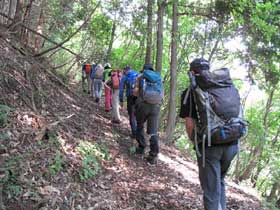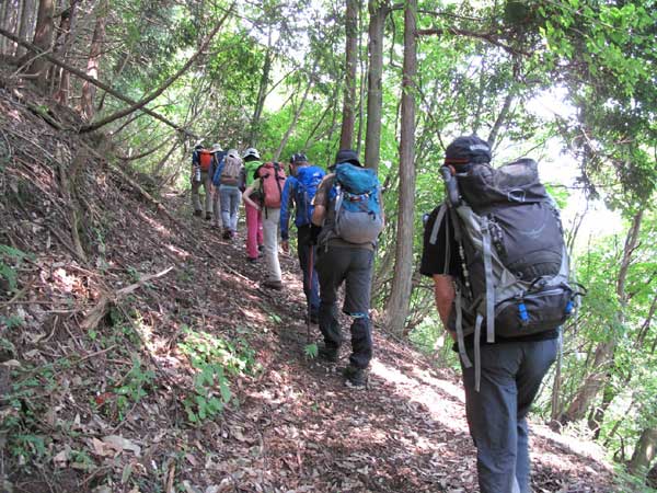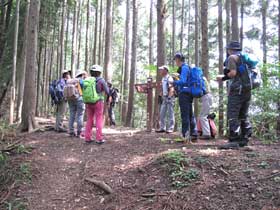 朝から真夏の太陽が照りつけ奥多摩の登山には厳しい暑い日である。JR川井駅に集合し、赤杭尾根登山口まで車道を約10分歩く。登山口で出発準備を行い、暑さ対策として特に小まめな水分摂取を指示して出発。尾根に取り付く急坂を10分程登ると緩やかな樹林帯の尾根道となる。太陽の直射から逃れられたが気温が高く、汗が流れ出る。