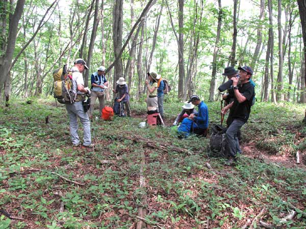 防火帯の尾根をヤマオダマキなどの花を観賞しながら登り、狼住所(オオカミスンド)を通り、曲ケ谷北峰で日向沢の峰への縦走路に合流。川苔山の山頂が目の前に大きく聳える。縦走路を約10分歩いて川苔山山頂に14時に到着した。山頂からは富士山、大菩薩嶺、奥多摩の山々のパノラマ展望が見られるはずだが、残念にも周囲は霞がかかって近くの山並みがぼんやり見えるだけであった。暑い中での長丁場の登りで疲れもあるので、長めの休憩時間を取り水分とエネルギーの摂取に努めて貰った。