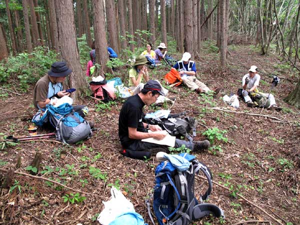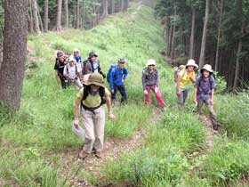 昼食場所から樹林帯な中の急坂を登る。西側に展望が広がる尾根に出たが、残念ながら夏霞で近くの本仁田山などが霞んで見えるだけ。夏藪に覆われた登山道を抜けると突然広い林道に出合う。標示板に従って林道を約15分歩くと、川苔山への登山道が急斜面に分岐する。これから川苔山への急登が始まるので、水分と行動食を摂取して出発した。樹林帯の中の急坂を一歩一歩登り、途中に多数の倒木があったが難なく通過し、約25分でエビ小屋山分岐に到着。東側に真名井北陵の山並みが見えて川苔山が近づいていることが分かる。更に樹林帯の急坂を約25分登ると広い防火帯の尾根となり、真名井沢の頭に着く。この暑さの中で約50分の急登は、途中で小休憩を取ったものの体力的にも厳しい行程であり、頑張って登ってきた受講生が頼もしく感じた。