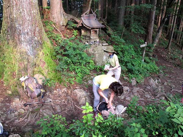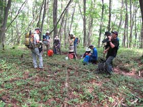 山頂を14時20分に出発。終着地の鳩ノ巣までは長い下りが続くので、植物観察なども行って下山することとした。山頂付近でノリウツギやイケマの開花、マユミの結実などを観察。縦走路を戻り、山頂下の道標で鳩ノ巣方面への道に入り急坂を下る。約25分で舟井戸を通過すると、石の露出が多い登山道となり歩き難く、疲れた足には厳しい下りとなる。途中で水分摂取やトイレの休憩を取りながら、変化のない樹林帯の中の道をひたすら下る。やがて眼下に林道が見えて、山頂から約2時間15分の長い下りが終わり大根の山の神に到着した。相当に疲れも出たので少し長い休憩時間を取り、水分とエネルギーを摂取して鳩ノ巣への最後の下りに備える。鳩ノ巣への下山道も足場が悪く、慎重に歩いて約40分で無事にJR鳩ノ巣駅手前の観光トイレ広場に到着した。ここで最終ミーティングを実施し、登山教室を終了した。