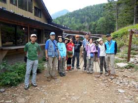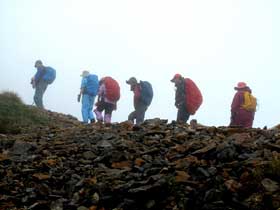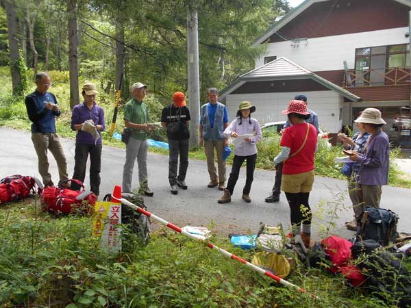 9月7日、夜中に強い風雨があり硫黄岳登山の実施を心配した。夜明けとともに風雨は止んだか霧が一面を包んでいる。朝食終了後、登山準備をして小屋前に集合。霧と樹林の雨垂れ等を考えて雨具着用を指示する。7時5分に硫黄岳を目指して出発した。大同心沢、ジョーゴ沢の桟橋を渡ると、樹林帯の中のジグザグ道の長い急登が続く。途中で衣服調整を含めて2回の休憩を取り、森林限界を超えて赤岩の頭(2656m)に8時45分到着。周囲は霧に被われ眺望は全くないが風がないので安心する。全員が集まり宮崎講師からの森林限界の危機管理の説明を聞く。山は森林限界を超えると自然が猛威を振るう別世界に急変する。登山者は森林限界を境に危機管理意識を切り替えて行動する必要性を強く説明された。