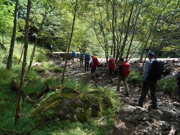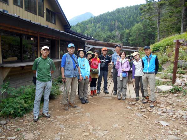 9月6日、2期初級登山教室としては2回目の宿泊山行であり、今回は森林限界を超える山への登山である。JR茅野駅前バス停に集合する。定期バスに乗車し終点の美濃戸口で下車。天候は予想以上に青空が広がり、バスの車窓からは八ケ岳の山並みが眺められて気持ちが昂る。バス停広場でミーティングなどを実施し、宿泊先の赤岳鉱泉に向けて出発した。林道を約1時間歩き美濃戸山荘で昼食。更に北沢コースの林道を1時間歩き堰堤広場に着く。ここから登山道となり沢沿いの道を左岸、右岸と繰り返し桟橋を渡りながら歩く。地図読みを行い、どちらの岸を歩いているかで現在地の確認が容易にできることを説明する。赤岳鉱泉には14時40分到着。少し休憩し、部屋に荷物を置いて中山展望台に出発した。