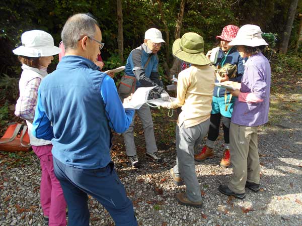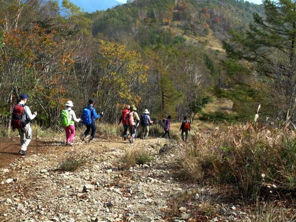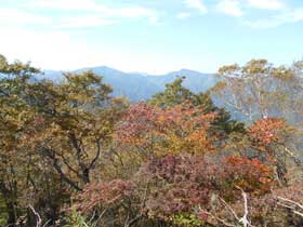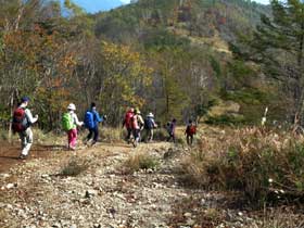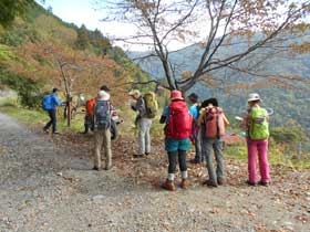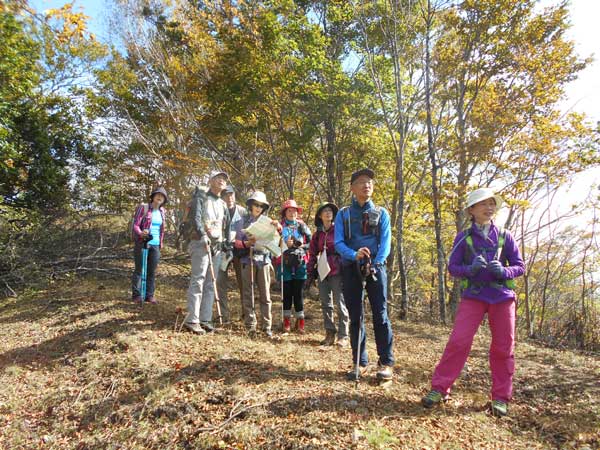 昼食を早く終了し、紅葉が始まった石尾根を鷹ノ巣山山頂を目指して出発した。登りの途中で雲取山や日陰名栗山などが良く見える。山頂には素晴らしい展望が待っていて感動の声があがる。受講生には眺望できる山を目印させおいた地図で、展望の山々を説明する。丹沢方面は雲に覆われているが、登山教室で登った奥多摩三山や大菩薩嶺、そして富士山、小金沢連峰、奥多摩の山々が確認されて受講生の目が輝いていた。
