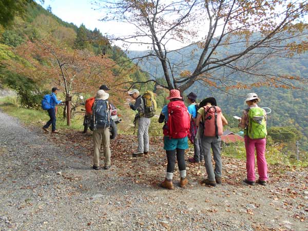 早朝のJR青梅線に乗車し、奥多摩駅前バス停に集合する。8時21分発峰谷行き路線バスに乗車して終点で下車。天候は薄曇りで青空が少し見える。バス停広場でミーティングなどの出発準備を行う。今回の登山教室は、標高差約1100m歩行時間約6時間30分と体力的に厳しい山行であり、気を引き締めて出発した。峰谷川沿いの自動車道路を歩き三沢集落に入り、迷路のように分かり難い急坂の小道を暫らく登る。やがて視界が開けて東京都で最も標高が高いと言われる奥集落に到着。広い自動車道路を歩き鷹ノ巣山登山口の道標を見て登山道に入り、少し歩いて浅間神社入口に着く。ここから浅間尾根の登りが始まる。