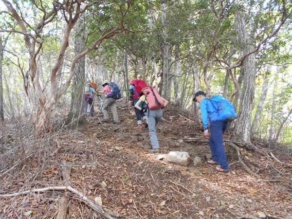 名残り惜しいが鷹ノ巣山山頂を出発して石尾根を東に下る。道標に従い水根・倉戸山方面の道に入る。すぐに鷹ノ巣山巻道と合流し、再び樹林帯の中の道を行く。暫らく歩くと水根沢と倉戸山の分岐に到着。水根沢林道は土砂崩壊で通行止めである。予定どおり倉戸山方面の榧ノ木尾根の道を行く。榧ノ木尾根は、幅の広い樹林帯であり落葉等が積もって登山道が不明瞭である。ルートファインディングの学習には好条件なので、受講生にパーティーの先頭を交代で歩いて貰う。スタッフが付き添いアドバイスをしながらの歩行である。やがて登山道は榧ノ木山を巻くが、山頂には登り3分程度で行けるので往復する。受講生全員の先頭歩き交代が終了とともに倉戸山に到着した。受講生にとって先頭歩きは初めての体験であり、少し緊張があったようだが、また一つ貴重な経験を積んだことと思う。