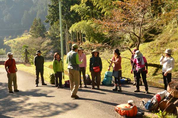 好天が予報された25日。集合場所の東青梅駅前バス停では、快晴の空が広がっていた。今日の生徒さんは、当初25名が申し込んでいたが、体調不良・予定変更等で集合したのは17名となった。スタッフ合わせて30名は、登山口である上成木バス停に向かって出発となった。
