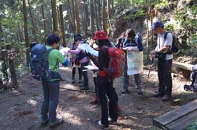 昼食後、出発。黒山に着く。ここは先月登った高水三山から合流する分岐であり、三山もよく見えている。ここで班ごとに記念撮影後、埼玉県方面への分岐である権次入(ごんじり)峠を過ぎ、東西に広い山頂が特徴の棒ノ折山に到着した。