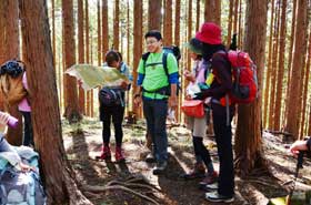 出発前にグループミーティングと準備体操ののち、3班を先頭に1班・2班の順に時間差でのスタートとなった。小沢峠の急登を経て、緩やかなアップダウンを越えながら、登っていく。所々でこの尾根のことを「常盤尾根」と呼んでいる標識が出てくるが、途中の「黒山」のことを「常盤山」と呼んでいるそうである。杉林が連続し眺望に恵まれない登山道だが、天気も良く時折吹いてくる風が心地よい。うっすらと汗をかいたところで、広場のようなところに出た。畠山重忠が馬術の稽古をしたとする「馬乗馬場(まのりばんば)」という標識が立っている。ここで昼食とする。