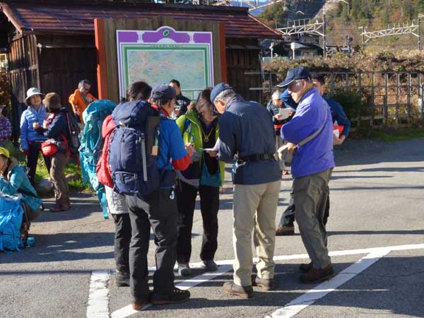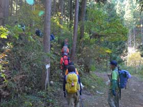 今回は、比較的歩行距離が短く、時間に余裕があったので以前から実施したかった「持ち物の講習」を林道の広いところで約1時間かけて行った。初冬の登山には防寒対策としてどんな服装・装備が必要か、班別にリーダーの持ち物をザックから1つずつ出して紹介し、またそのパッキングの仕方などの一例を示した。受講者からは質問が出るなど関心があったようだ。