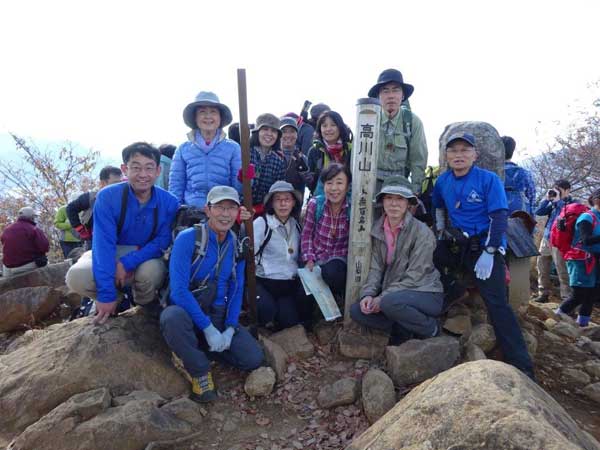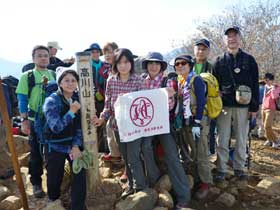このコースは樹林が多く、あまり眺望は利かないが、枯木の間から滝子山方面が見え隠れする。少し平らで広い休憩場所にふさわしいところを過ぎると間もなく頂上である。晴天の土曜日とあって狭い頂上は登山者で賑わっていた。富士山をバックに班別の集合写真を撮るのに苦労する。頂上から5分下ったところにある古宿・松葉コース分岐点は広く平らなのでここで昼食となった。多少の時間差はあったが3つの班一緒に昼食をとる。