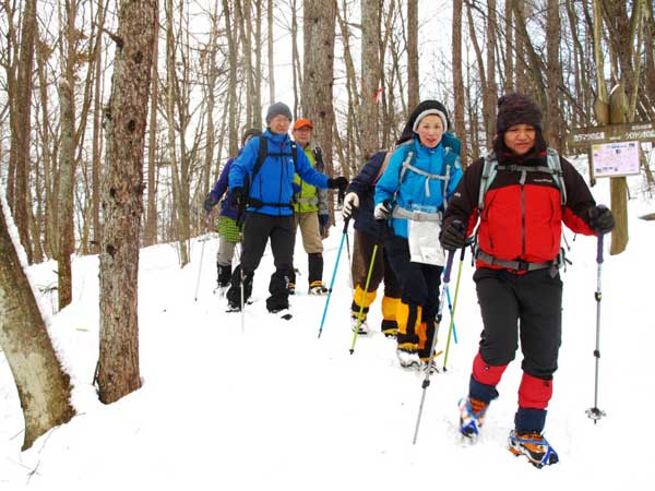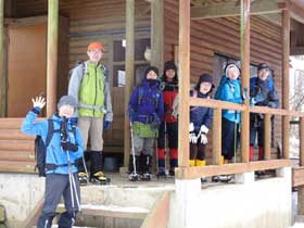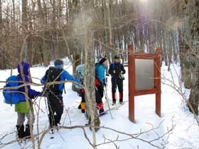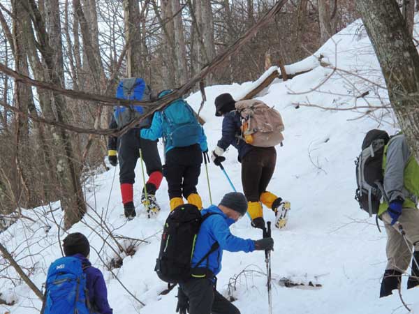 事務所で積雪状況などを確認し、体験の森の中の林道を行く。林道には約10pの積雪があり、雪上歩きが単調な林道歩きを楽しくしてくれた。トチノキ広場で休憩し、更に積雪が多くなった林道をキックステップなどで歩き、カラマツ広場への登山口に到着。ここでアイゼンを装着した。受講生は昨年5月徳本峠以来のアイゼンであるが、手慣れた様で短時間で装着完了。宮崎講師からアイゼンの歩行方法と注意事項の説明があり、急斜面の登山道を登行開始した。細いトレースをアイゼン歩行の感覚を思い出しながら歩き、予定時刻を少し遅れたがカラマツ広場に到着し、東屋で昼食とした。