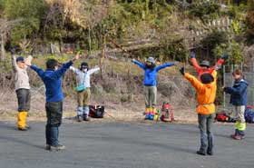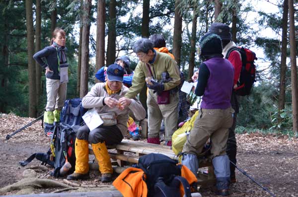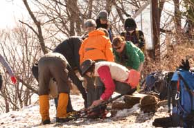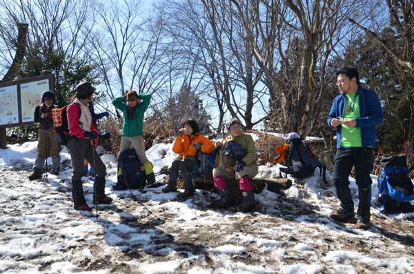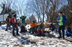 明王峠で昼食後、40分ほどで陣馬山到着。日当たりのよい山頂では雪が解けて、あたりは田んぼのようになっていた。小仏を出発して5時間。生徒さんにとって今回は、アイゼンを付けて雪道と泥道を交互に走破する負荷のかかる登山であったが、調子を落とすこともなく全員笑顔で登頂記念撮影後、これまた長い下山にかかる。一時間余りの歩きののち、登山道が途切れるぽかぽか陽気の里山から今度は舗装道路を延々歩いて、移設されたバス停にようやく到着。登山靴に大量に付いた泥を近くの川で洗い流し、事前に予約してあった増便バスに予定より早く乗車できた。