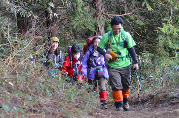 昨年は大雪に泣かされて裏高尾にコース変更となったが、おかげで雪山をたっぷり味わいアイゼン装着・歩行は大いに経験を積むことができた。今年はふもとのあたりに雪はないものの、縦走路にはかなりの積雪との情報があった。好天に恵まれて、高尾駅北口には総勢29名が揃い、増便されたバスで小仏に向う。出発前に各グループで体操・注意点の確認などを行い、3班を先頭に5分間隔で出発となった。