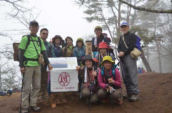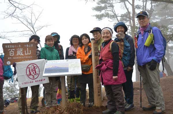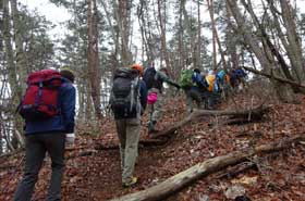 やがて907mのピーク近くで尾根に出て、静かな林間の尾根道を登り百蔵山に到着。ここからの下りが急で滑りやすく、過去の山行でも時間を要した所だ。下見の時はここでフィックスロープを張る練習をした所でもある。ロープを背負った河野山行リーダーが先行して、急斜面の中間地点で待ち構えてくれたが、皆慎重にかつ危なげなく下り、ロープは使わずに済んだ。難所を無事通り過ぎ、受講生もスタッフもホットしたところ(宮谷分岐点)で昼食をとる。この先は標高差360mの長い登りである。最も体力を消耗するところだが、誰も遅れることもなく、また疲れた表情もせず、森林浴を楽しんでいるような笑顔で黙々と歩く。途中1回の休憩で扇山(1138m)に到着。山頂は相変わらず厚い雲の下で遠望がきかない。全員で写真を撮り、「大月秀麗富嶽(7)」のきれいな写真入りの大きな看板を眺め、また来る時の晴天を祈って山頂を後にした。