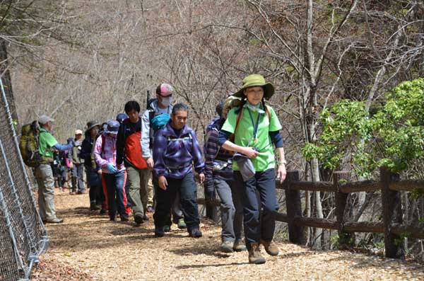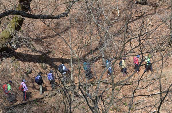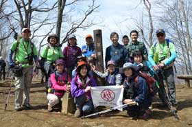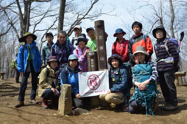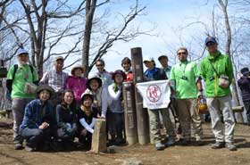 昼食後、三頭山西峰を目指して出発。ムシカリ峠に戻り、北側の階段状の急坂を約20分登ると山頂に到着した。山頂周辺の樹木はまだ芽生えておらず、樹木の間から周囲の山並みが良く見える。地図を広げて見える山々の説明を行う。北側には雲取山、鷹ノ巣山などの奥多摩の山が、南側には富士山、三つ峠などの山が良く眺望できた。山頂で集合写真を撮り、下山を開始した。