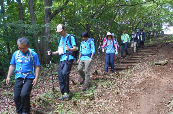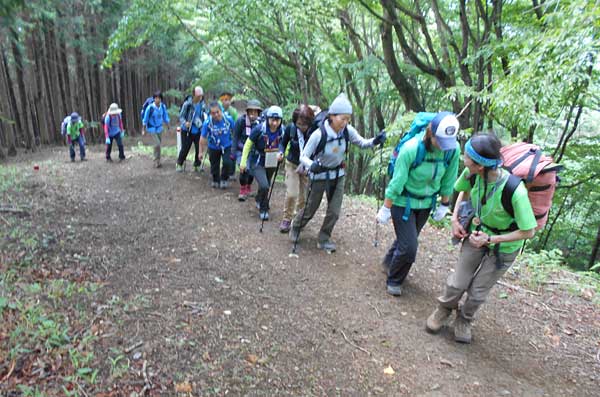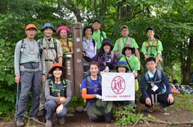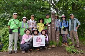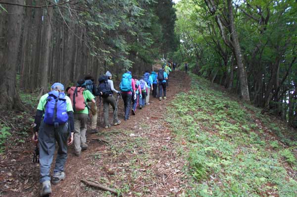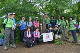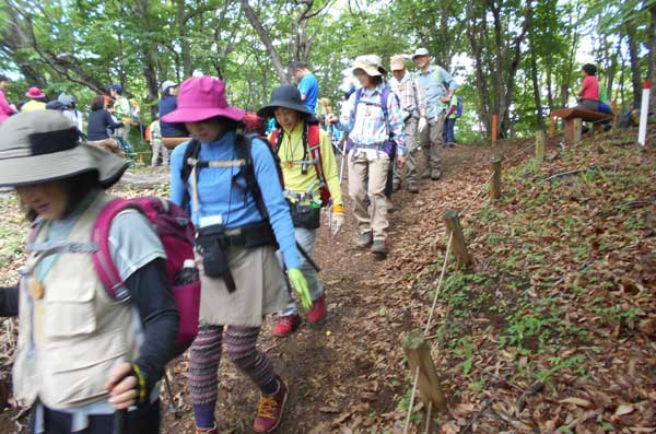 昼食の間に、多数の登山者が奥多摩湖の大ブナ尾根ルートから登って来て、山頂はカタクリ開花時期のような賑わいとなった。他の登山者に昼食場所を譲って御前山に向かって出発した。少しぬかるむ登山道を約20分歩く、御前山山頂に到着。ここも梅雨時期とは思えない程の多数の登山者で賑わっていた。山頂からの展望を期待していたが残念にも雲に被われて何も見えない。しかし受講生からは、奥多摩三山を完登したという喜びの声が聞こえた。山頂で集合写真を撮り、下山を開始した。