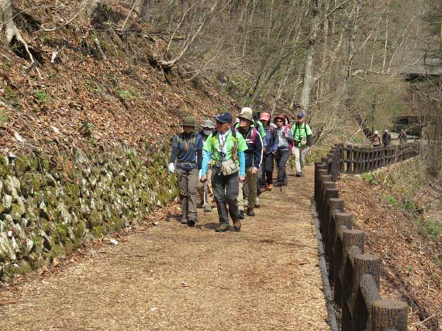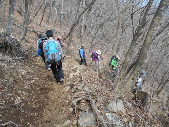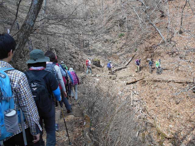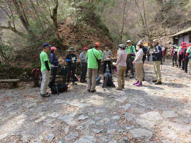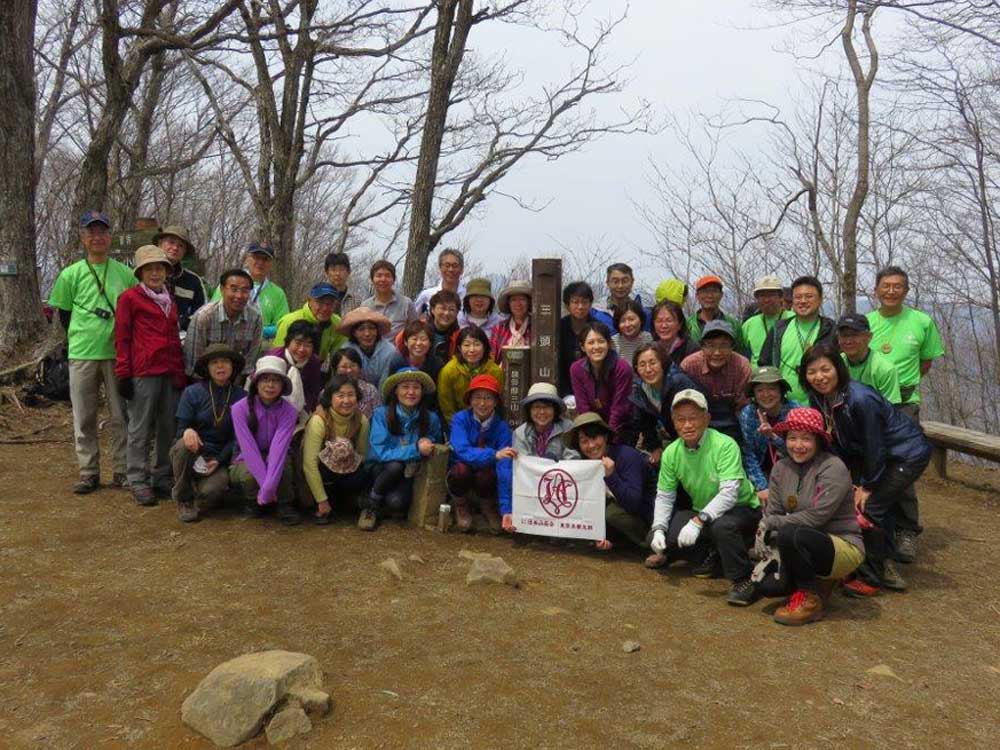 昼食を終え出発、ムシカリ峠を抜けこの日の最高点である三頭山西峰に向かう。山頂からの眺めはかすんでおり眺望こそ良くないが、昼食を摂る多くの人で賑わっている。最後の班の到着を待ち全員で記念写真を撮る。下山時の注意を受けた後に登ってきた道を降り始める。初めての登山だという受講者もいる中、ほぼ既定のコースタイムで順調に下山をする。途中でキクザキイチゲやヨゴレネコノメを見つけ、その度に足を止めて写真などを撮る。到着間近には受講生同士もだいぶ打ち解け合い、互いに言葉を交わすようになっている。