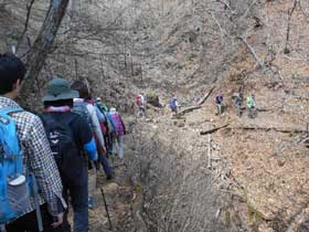 今回は初めての実習にもかかわらず、全員の体力と技術がそろっており、ほぼ安定した歩行を行い標準コースタイムで踏破することができた。半年間の教室でどれだけ上達するのか、とても楽しみである。次回の登山実習は5月の大岳山である。