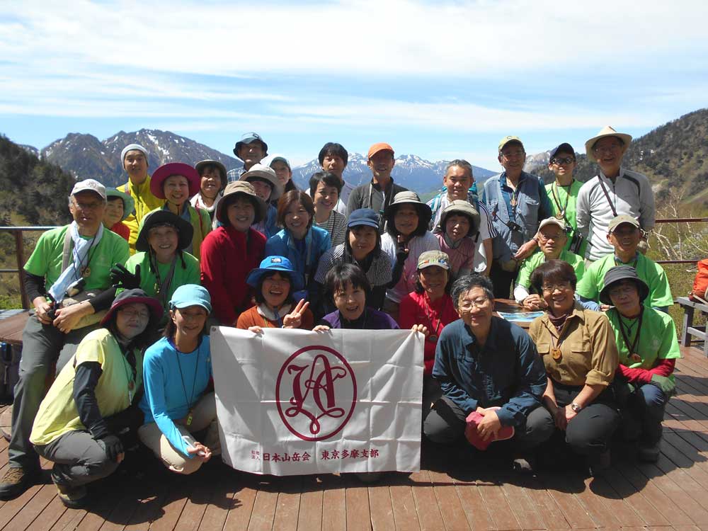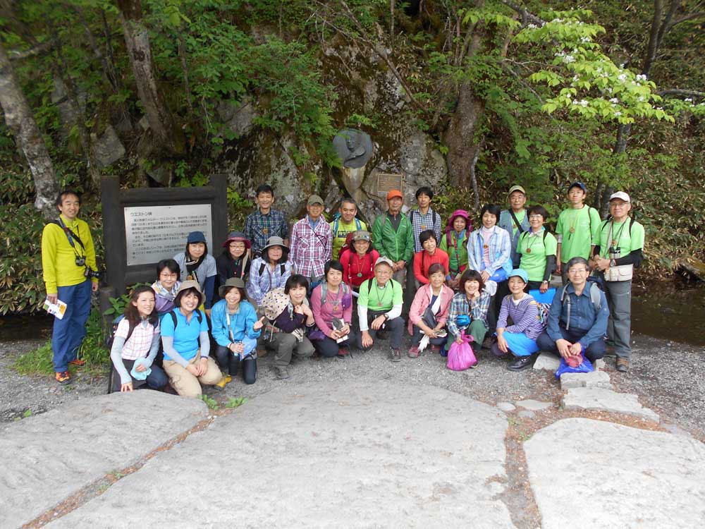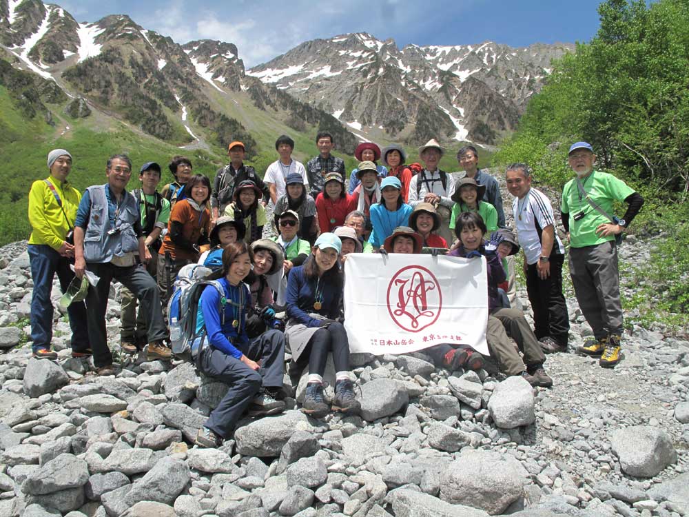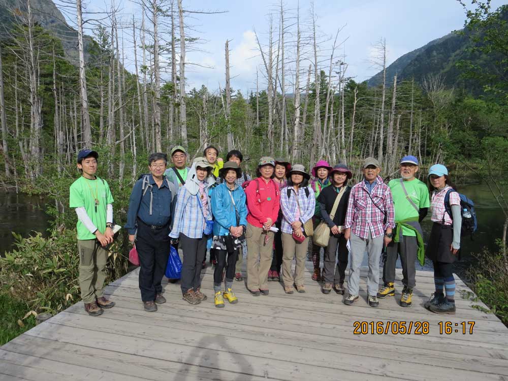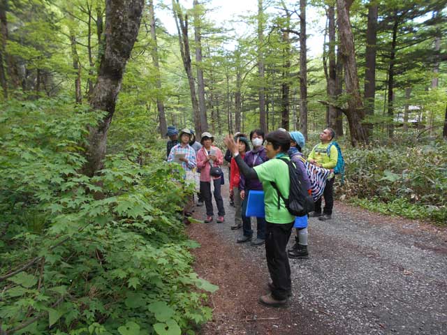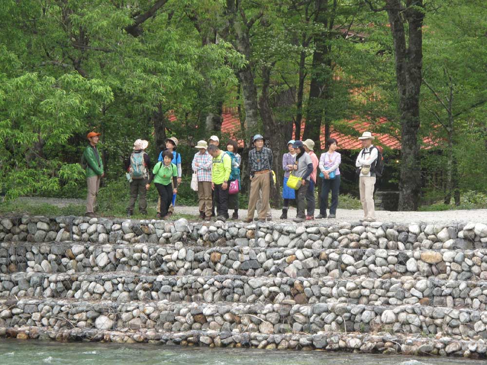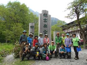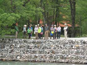 13時05分、山研玄関前に集合。2班に分かれ、西村・中村正之の両会員の説明で上高地散策に出発した。河童橋を渡り、梓川左岸道を明神方面に歩く。ズミの白い花が咲き、今年の上高地は季節が早く進んでいるようだ。小梨平に流れる川が澄んでいるのに感動し、道路の真ん中を大きいサルが堂々と歩いているのに驚く。明神岳5峰の岸壁を見上げ、特別名勝・特別天然記念物の上高地の自然をゆっくりと説明を受けながら歩き、14時35分に明神に到着。更に徳沢園への道に足を伸ばし、徳本峠の道を説明し、その先でピラミッド型の常念岳を眺めて明神に戻る。