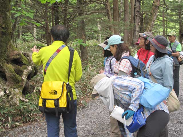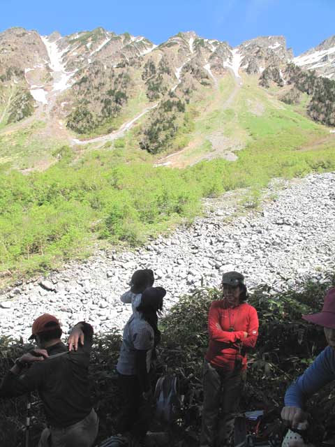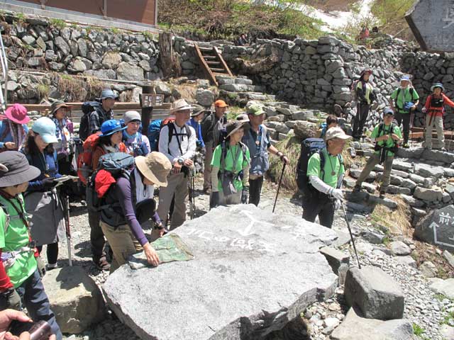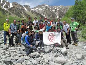 名残は尽きないが、11時になり下山準備を行う。登ってきた同じ道を山研に向かって下山を開始した。ダケカンバ林の中の道を足元を注意しながら下る。樹林が切れて穂高岳が眺望できる場所では、どうしても足が止まる。この景色にまだ未練があるらしい。途中で展望の良いガレ場で休憩をとり、穂高岳を背景に集合写真を撮る。ツガとシラビソの樹林帯に入り、天然クーラー風穴を通過し木の根や石が多くなった道を慎重に下る。木道が出てきて眼下に林道が見えて岳沢登山口に到着。林道を歩き13時15分山研前に到着。広場で整理体操と終了ミーティング゙を行い、入浴と帰宅準備のために山研に入る。