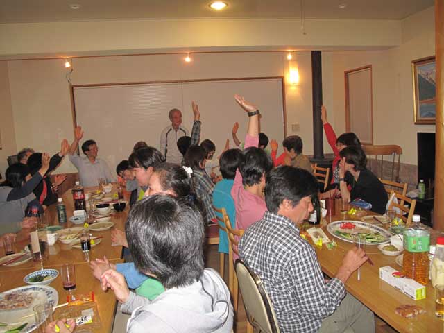 18時30分から夕食を兼ねた懇親会を行う。上高地散策中に食事と懇親会の準備をしてくれた北原、東、中村の女性3会員に感謝する。懇親会には管理人の元川さんも加わり、食堂は満杯状態である。全員があらためて自己紹介と登山教室への想いを話し、受講生同士やスタッフとの親睦が図られ大盛会の懇親会であった。