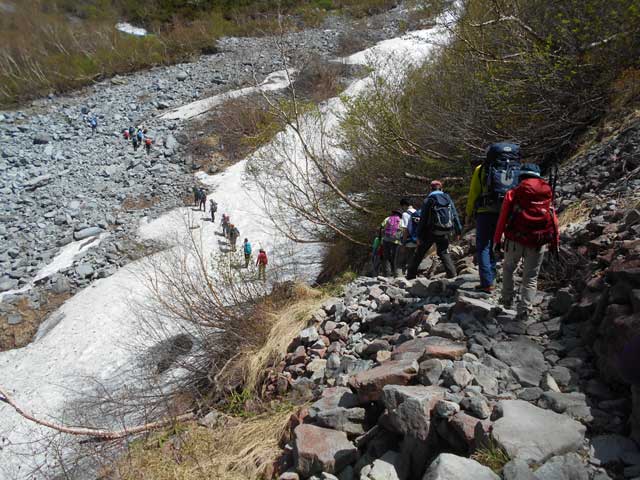 風穴から約15分で樹林帯を抜けてガレ場に出た。青空が広がり眺望が開ける。後ろを振り返ると乗鞍岳の大きな姿が眺望できる。残雪がないので夏道登山道を歩く。ダケカンバの林を約25分登ると展望が良いガレ場に到着し休憩。目の下には上高地が広がり河童橋が小さく見える。山側を見上げると西穂高岳から奥穂高岳の岸壁が連なり、この素晴らしい景色の写真撮影に夢中である。急登が続き9番胸突き八丁を登り切ると岳沢小屋への小さな雪渓が見えた。雪渓を横断し急坂を登ると岳沢小屋に9時55分到着した。