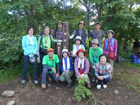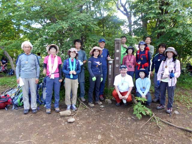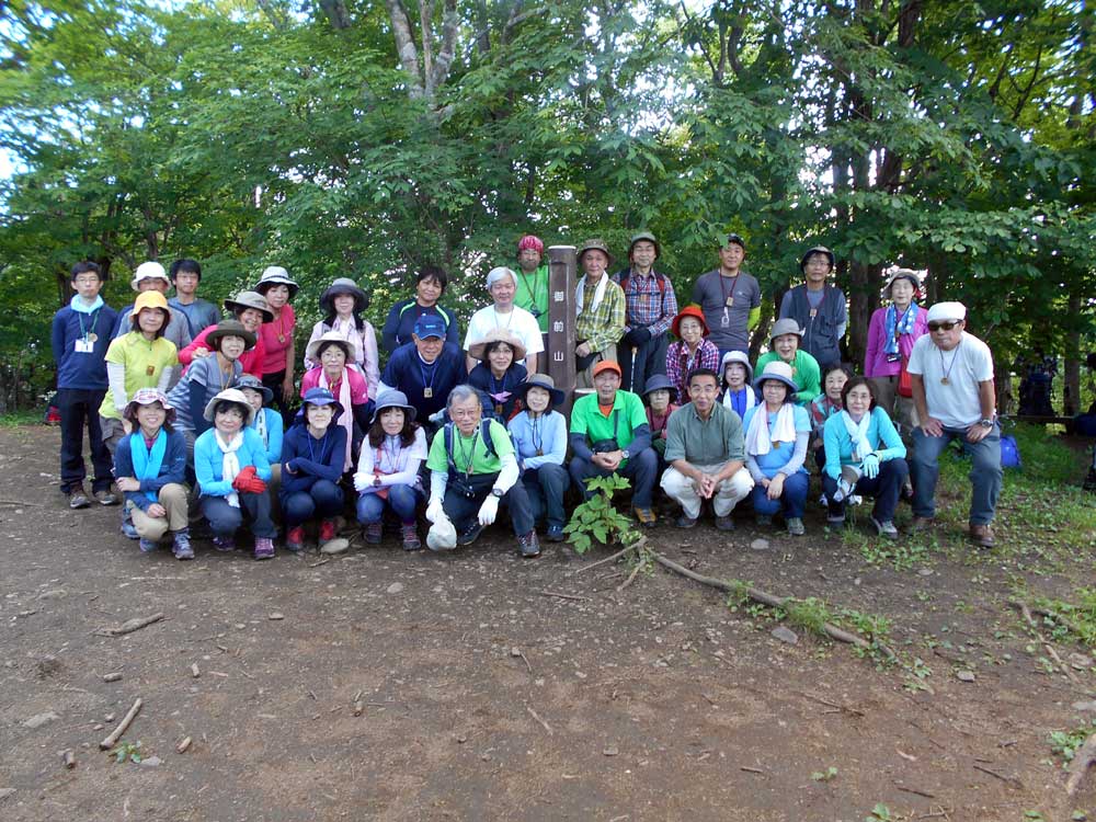 小休止ののち、惣岳山への本格的な登りとなった。このあたりから虫が少しずつ姿を出し始めてきたが、かつてのような集団による来襲とはならなかった。1時間ほどで惣岳山に到着し昼食となった。奥多摩湖方面からの登山者も多く、ちょうど昼食時と重なったこともあり、食事場所の確保にはみなさん苦労していた。昼食後、20分ほどで山頂に到着すると、奥多摩三山を初めて踏破したことに軽いハイタッチ。完登の感激にしばしふける場面が見られた。少し遅れて到着した1班のみなさんと全員で登頂記念撮影。支部旗がなかったことはご愛嬌だった。