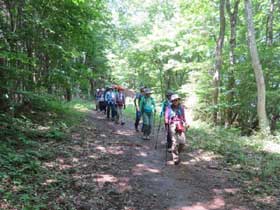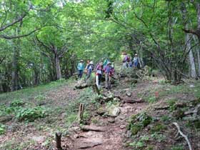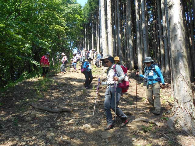 天気には恵まれているが、樹林帯での登山道であるため直射日光には当たらずに済む。さわやかな風がここちよく、虫の来襲もなく1時間かからないで小河内峠に到着。樹木のところどころから、奥多摩湖や石尾根方面の山々が顔をのぞかせている。みなさん、歩き方の基本を忠実に守って順調に歩を進めていて、足取りも軽い。