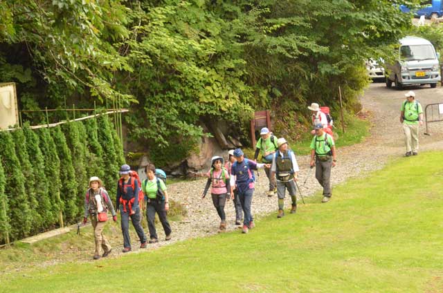 早朝から結構な雨が降っている。今日は第5期の初級登山教室の最初の山行なのに、出発からこの雨では先が思いやられるというのが実感だった。集合場所ではさらに雨足が増し、ドタキャンの受講生が多くいるだろうと予想したが、一人の欠員もなく全員が時間までに揃った。みなさんの熱意がこちらにも伝わってくる。チャーターバスは予想された渋滞を抜けて、登山口のプール平にほぼ時間通りに到着したが、トイレ・準備体操などを経て、少し遅れての出発となった。例年なら沢沿いの登山道を行くのだが、今回は時間短縮のため車道を通っての出発となった。