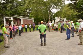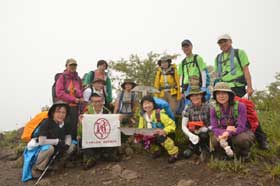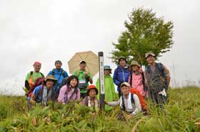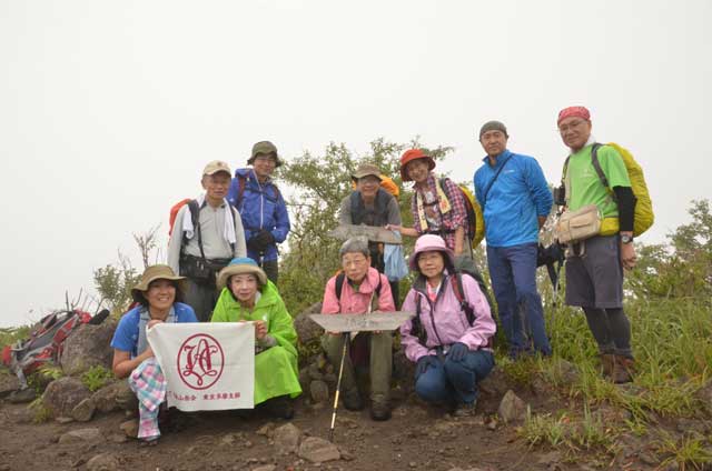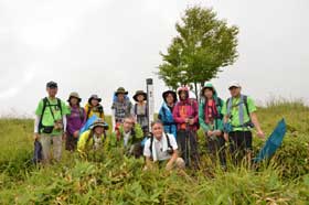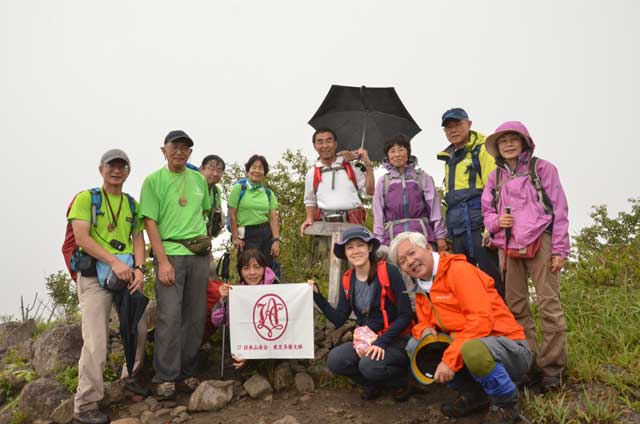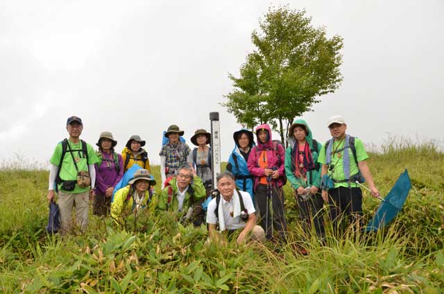 昼食予定のヒュッテアルビオレには、やや遅れての到着となった。ここでも食事の最中に、雨脚が早くなったり、薄日がさしたりと、落ち着いての食事とはならなかった。集合写真を撮って、早々に出発して標高1869mの八子ヶ峰東峰で班ごとに記念写真を撮影。さらに八子ヶ峰本峰(1833m)あたりからガスが厚くたちこみ始め、ホワイトアウトの中をスキー場のゲレンデを経て、ようやくバスの待つ八子ヶ峰公園には、この天候にもかかわらずほぼ予定通りに到着した。このような悪条件の中、体調不良を訴えた受講生が複数発生したが、いずれも症状は軽いとのことで、全員無事に山行を終えられたことは、みなさんのご協力の賜物である。