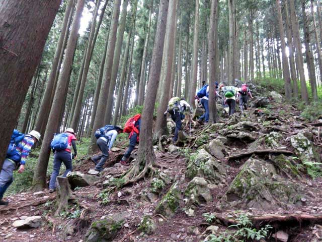 昼食後、全体での集合写真を撮り、惣岳山へ向け出発。この区間も、岩茸石山直下と惣岳山直下の急坂が注意を要する。「昼食後は事故の多い時間」という机上講習で学んだことを確認し、慎重に下山する。要所要所で読図を行いながら、岩茸石山からほぼ真南におよそ40分で惣岳山直前の岩場に到着した。ストックをしまいながら、危険な箇所は三点確保を心がけること、足下ばかりに気を取られず顔を上げルートを確認することなど、これまで習ってきたことを再確認する。巻き道との分岐から岩場を見上げたときは、「木の根が滑りそうで怖い!」と言った声も聞こえたが、歩き始めれば皆さんしっかりとした足取りで本日最大の難所を通過していた。