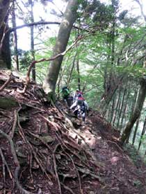 岩茸石山までの間の注意箇所は、高水山直下と岩茸石山直下の急坂である。3班受講生は、「鉛直を意識して、正しい姿勢で歩く」とのリーダーの指示を受け、ザレ場や赤土など滑りやすい箇所を通過する際の足の進め方を確かめていた。