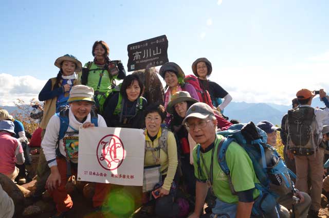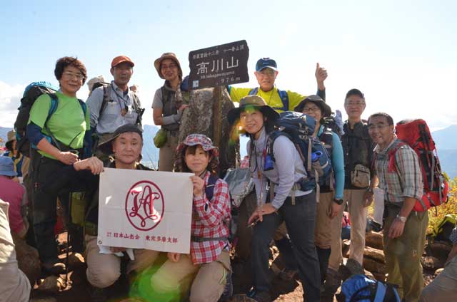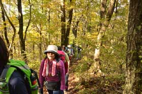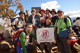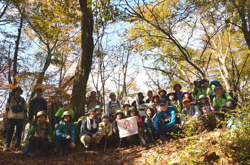 頂上手前のなだらかな尾根辺りの紅葉と木漏れ日が疲れた体を癒してくれる。順調に登ってきたが、既に高川山山頂から下山してくる登山者に出会う。多分、頂上は満杯なのだろう。最後の急登で頂上に出るが、やはり山頂は登山者で一杯である。富士山も良く見えている。残念ではあるが、班毎に記念写真を撮り早々に下山する。急な滑り易い登山道を注意しながら下り、禾生駅分岐の鞍部を過ぎた「むすび山」に登り昼食とする。受講生、スタッフから果物やお菓子のサプライズをいただく。