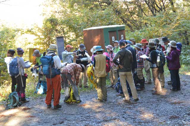 昼食後に先程の鞍部に戻り、全員写真を撮りいよいよ下山である。一部急で滑り易い下りをこなし、陽を浴びた紅葉を堪能しながら沢沿いの道を下る。林道に出たところで地図読み。尾根、沢の状況から現在位置を確認する。林道を暫く下った所の陽だまりで、班リーダーの持物確認をする。個人装備表以外の持物も何のために持って来ているかを解説しながら受講生に確認してもらう。共同装備、薬品袋についても確認してもらった。後は、のんびり周りの景色を楽しみながら禾生駅に1時間ほど早く下山した。受講生には少し物足りない山行であったようである。