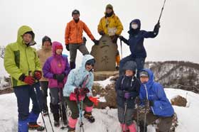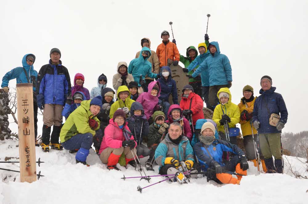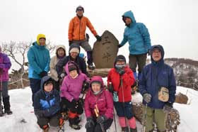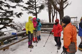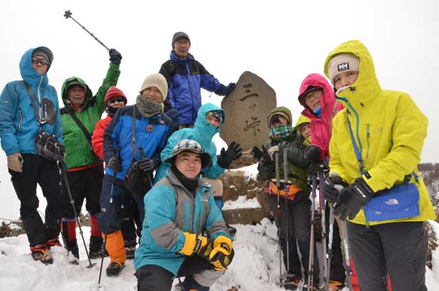 山荘の主人中村さんに挨拶をして、山荘前ベンチで昼食をとる。寒さが厳しく食事時間を15分程で切り上げ三ツ峠山山頂への登山準備をする。ザックは山荘横にデボしてカラ身で山頂を目指す。四季楽園の山荘前を通り雪の急坂を約15分登ると大きな石碑が建つ1786mの山頂に到着。山頂は360度遮るものがないが、周辺は白い雲に覆われ何の展望もない。山頂近くや隣の御巣鷹山に建つ電波塔だけが良く目立つ。風は強くないが温度計はマイナス9℃を指し、貴重な冬山の寒さを体験した。山頂石碑前で集合写真を撮って下山する。雪の急斜面を慎重に歩いて三ツ峠山荘に戻る。山荘の中村さんのご厚意で全員山荘の中の入り熱いお茶をご馳走になり一息をつく。中村さんには三ツ峠の地形ことやアツモリソウ保護などの貴重なお話しも伺った。