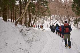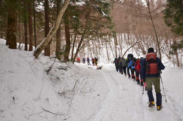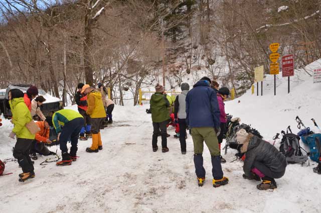 当日も今冬最大級寒波が南下の予報だが、青空の立川を貸切バスで出発した。三ツ峠登山口への御坂みちは除雪が進み、予定どおり登山口バス停付近までバスで入った。ここからトイレのある三ツ峠登山口まで舗装道路を歩く。登山口の駐車場は約40pの雪で埋まり、ここで登山準備をする。アイゼンを装着し三ツ峠山山頂まで標高差約530mの雪山登山を開始した。