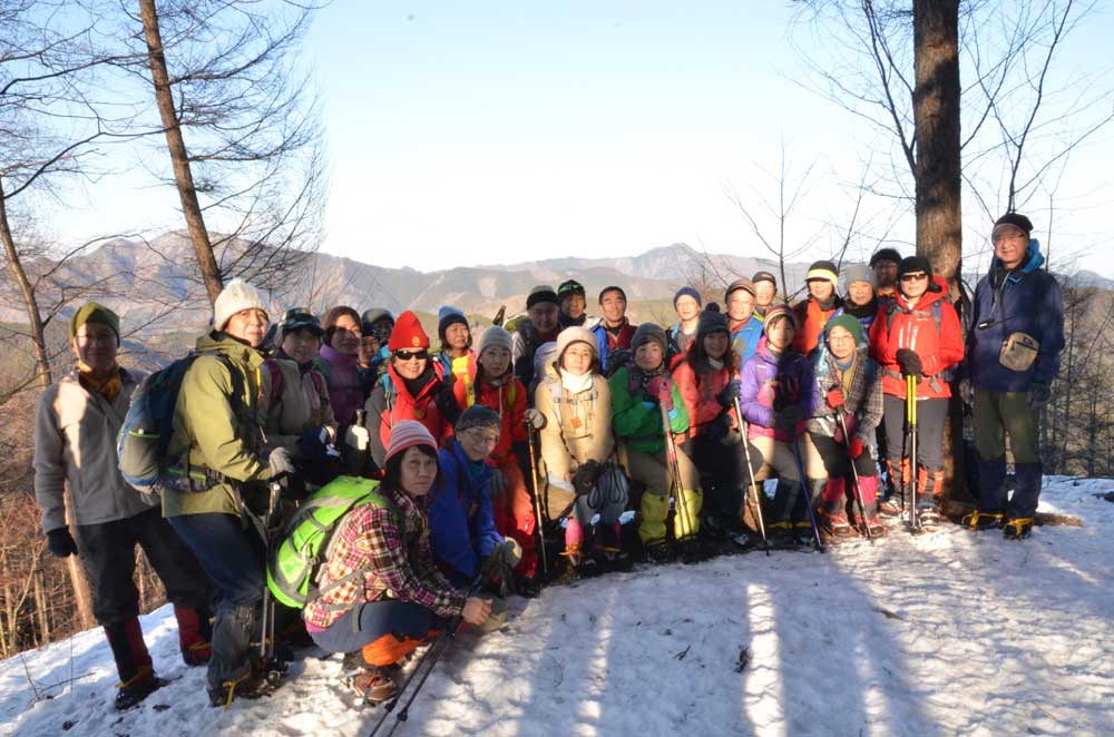 その後は、枯葉と雪まじりの比較的急な登山道を順調に進む。国定忠治遠見碑の近くで休憩。高度を〜300m稼いだせいか無風の空気が急に冷えてきた(マイナス1度)。この先は雪が凍り付いている可能性が強いので、アイゼンを装着する。前回の講習会で装着の練習を十分行ったお蔭で、皆迷うことなくスピーディにできた。積雪量も次第に多くなり、尾根近くの北斜面では〜20cmほどあり、アイゼンを信頼して、一歩一歩確実に、しかし楽しそうに、気がついたら槇寄山頂に着いていた。大山、丹沢連山、同志山塊、富士山、三つ峠、・・・を眺めながらのお弁当。登山の醍醐味を満喫する。