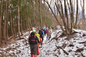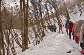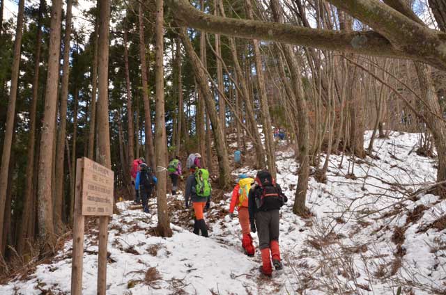 アイゼンを着けて歩く初めての山行。前日、東京の郊外では雪が降るかもしれないという予報で、雪景色を期待していたが、バスの車窓からは里には雪がなくちょっと不安になる。仲の平バス停でミーテイング、体操をすませ舗装された林道を〜20分。登山道に入るところで、民家の玄関に通ずる階段にはロープが張ってあって通行止め、並行してある凍りついたコンクリの5〜6mの急斜面を、アイゼンなしでストックを頼りに慎重に登る。ここが本日のコースの最大の難所! 靴底を斜面にフラットに摩擦面を広くして、机上で学んだことを実践する。全員滑らずに登り切る。