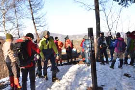 ここから大羽根分岐までが、起伏の少ない笹尾根だ。比較的広葉樹の多いこの尾根道からは、枯れ枝を通して南面・北面の遠くの山々が目に入る。天気が良い時は、ここは「ルンルン街道」だ。立派な道標がある所で、地図を広げて現在地確認する。大羽根分岐から笹尾根に分かれを告げて大羽根山へのなだらかな下りとなる。大羽根山頂からの北面の眺めも抜群である。受講生たちが登った奥多摩三山をはじめ、その奥には石尾根が(鷹ノ巣山から東側)、槇寄山では逆光の景色だが、ここは太陽を背にした景色なのでコントラストがはっきりしていて素晴らしい。これまでに登った山、これから登る予定の山、登りたい山・・・がみんな見える。いつまでもここで眺めていたいが、バスの時間が気になる。急いで下れば間に合いそうだが、初めてのアイゼン歩行だし、下りで急いでアイゼンを引掛けて転んだりしたらせっかくの楽しい登山が一転してしまう。予定のバスを1台遅らせて展望を満喫し、安全第一でゆっくり下ることになった。