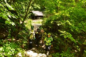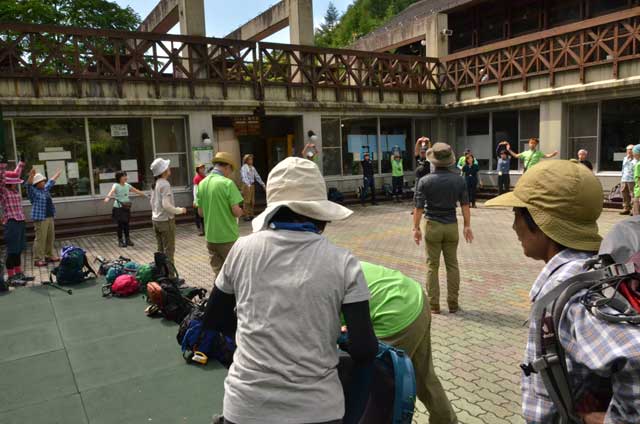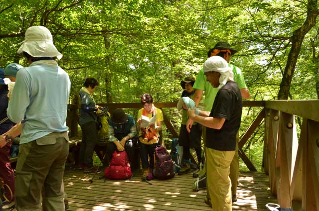 その後、地図読みの講習を行い、駐車場に移動。登山が初めてな方、高年齢の方が多い、真夏の気温・湿度の気候条件の厳しさなどで事前のスタッフミーティングでは、「相当ゆっくり歩く」ことを申し合わせていたが、以外にも順調なペースで進むことができ、全体としてほぼ計画通りの行程であった。受講生の中で出発時に膝の痛みがあったり、靴底が剥がれたりとアクシデントはあったものの、野口講師の手当や宮崎講師の靴リペアなどでリカバーができていた。こうして初心者登山教室実習の初日を無事に終えることができた。