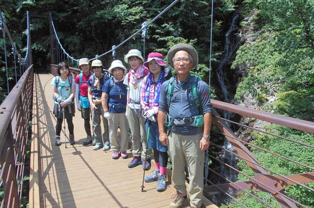 当日は若干雲が多いものの、まさに真夏そのものの天候である。集合時間前に全員が揃い、予定より早くバスは都民の森に到着した。駐車場横の広場は、ベンチや日よけ用テントなどがあって、全体ミーティングには不向きであったため、トイレを済ませてから森林館へ移動。ここで全体ミーティング・体操ののち、班ごとに自己紹介、ルート説明、服装・持ち物の確認を行い、3班より出発した。チップが敷かれた歩き易い遊歩道を経由して三頭大滝に到着。大滝を眺めた後、宮崎講師による地図読みの講習を行った。現在位置の確認に戸惑う人もいて、サポートの会員が熱心にフォローしていた。その後、本格的な登山道の登りに移り、ムシカリ峠への新緑が眩しいこぼれ日の中を進んでいく。この密集する葉っぱのおかげで、ほぼ全行程で直射日光に当たらずに済んだのは助かった。時おり吹く涼風にも大いに慰められた。