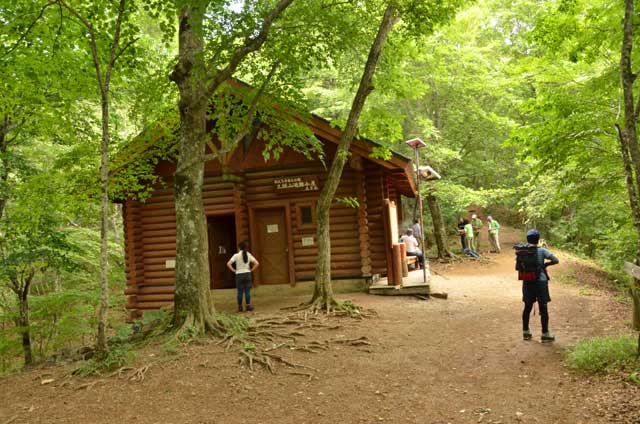 汗びっしょりになりながらムシカリ峠を通過して、避難小屋に到着。昼食となった。登山靴の底が剥がれたり、若干体調不良の受講生がいて、到着が遅れる班があったものの、おおむね計画通りのペースで三頭山西峰に到着した。さすがに人気の三頭山はグループ・家族連れなどが多く、山頂周辺は混雑していた。山座同定を教えられた受講生は、大いに頂上からの展望を楽しんでいたようで、あちこちでスマホのシャッター音が響いていた。人も多かった関係で、頂上での地図読みは森林館で改めて実施することにして、下山時の足の運び方などの注意点を指導してから、頂上を後にした。森林館へは順調なペースで進み、到着した時点で森林館を見学する時間があった。
