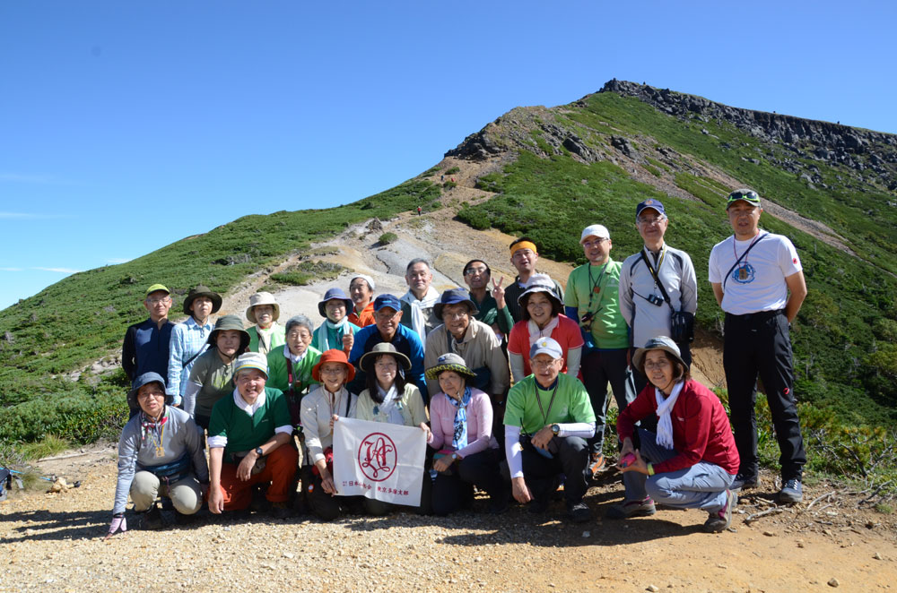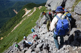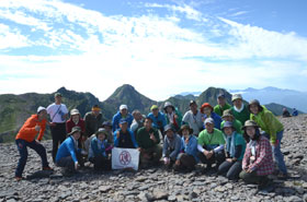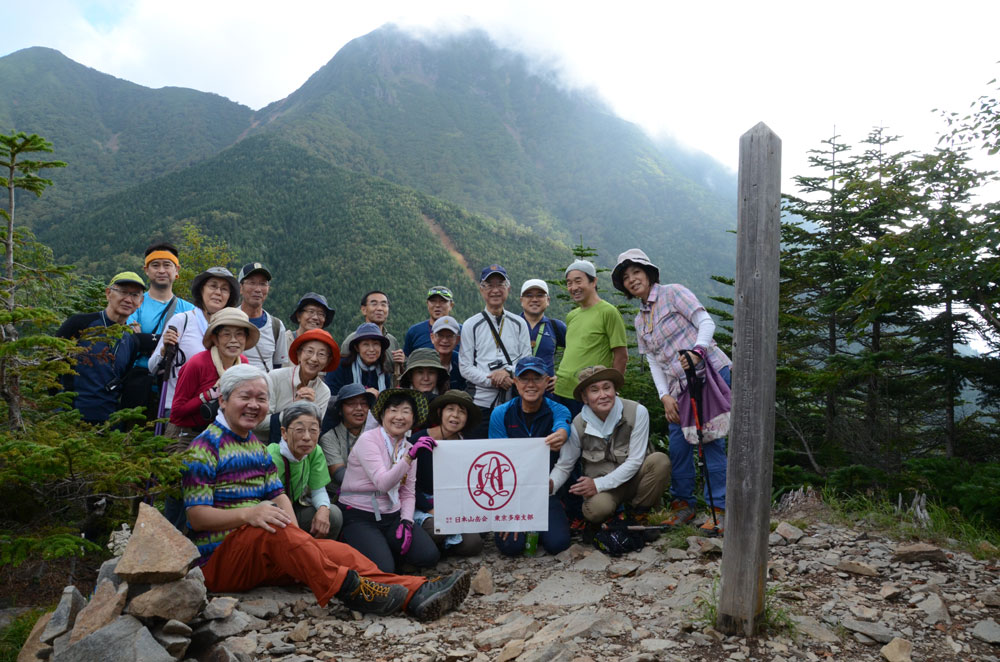 朝食を早々と済ませ小屋を後にし、硫黄岳に向かう。今日の天気は快晴である。硫黄岳はこの登山教室実習登山では標高が一番高い山であり、森林限界を越えた山行を体験することでもある。樹林の中をひたすら登る。赤岩ノ頭に飛び出すと森林限界を越え、一気に展望が開ける。360°の大展望である。北には、北ア、槍・穂高連峰、その手前には昨年8月に登った八子ヶ峰、左には乗鞍岳、御嶽山と続き、南には中央アルプス、南アルプス、更に阿弥陀岳、赤岳、横岳、奥秩父と連なる。